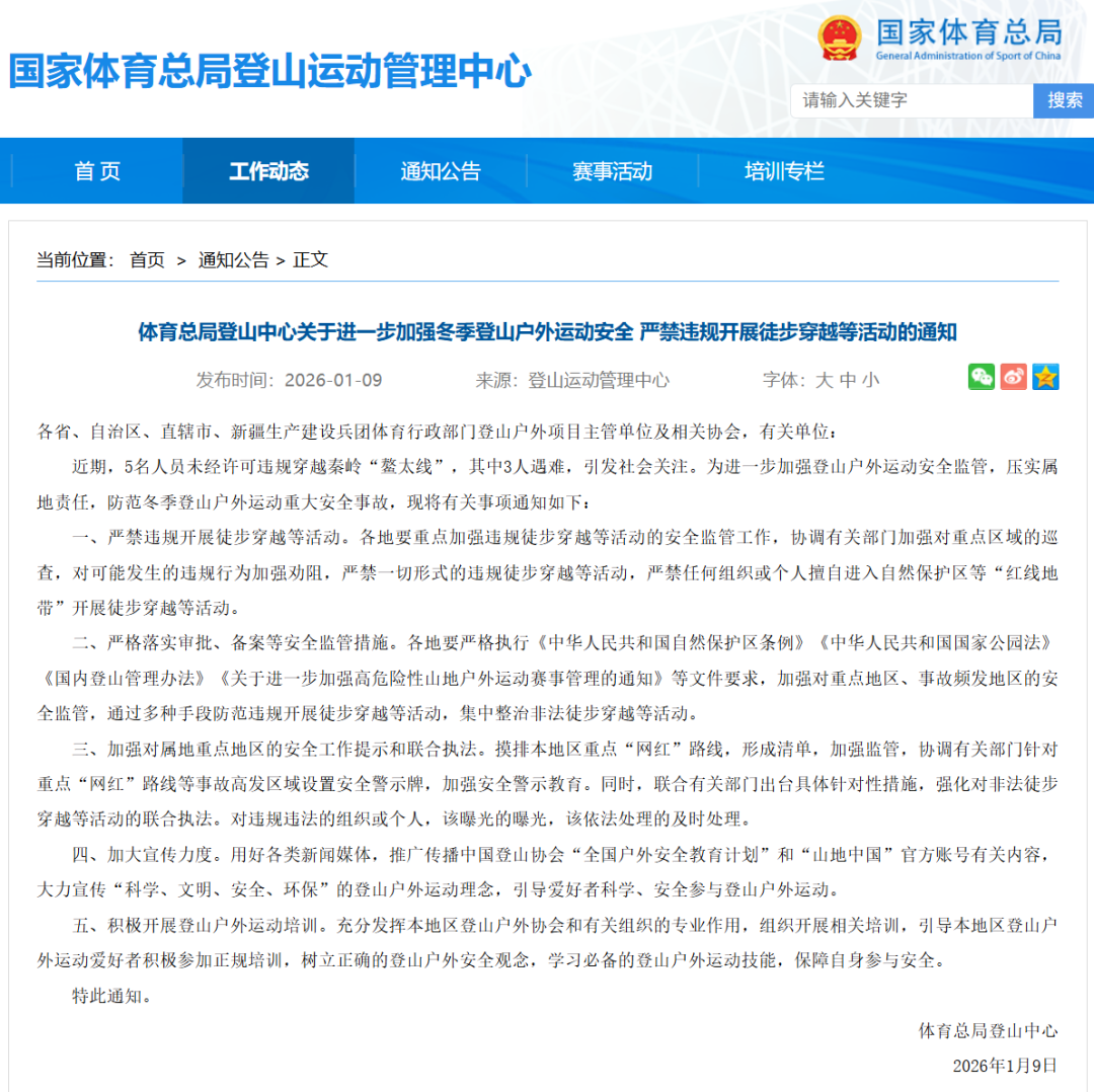 合规是探险的生命线。1月9日,国度体育总局登山畅通惩办中心发布见告,严禁违章开展徒步穿越等作为,辞谢任何组织或个东说念主私行干预当然保护区等“红线地带”。