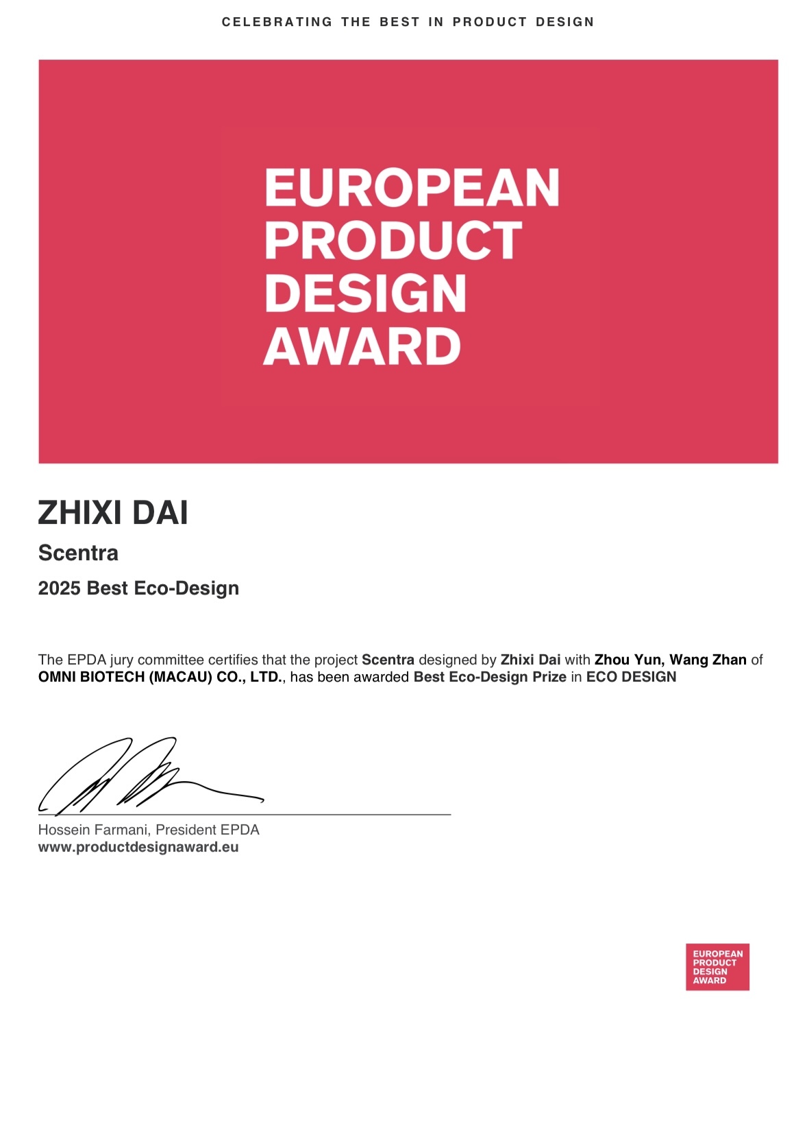 “澳露香”获2025年欧洲产物蓄意金奖(EPDA)。