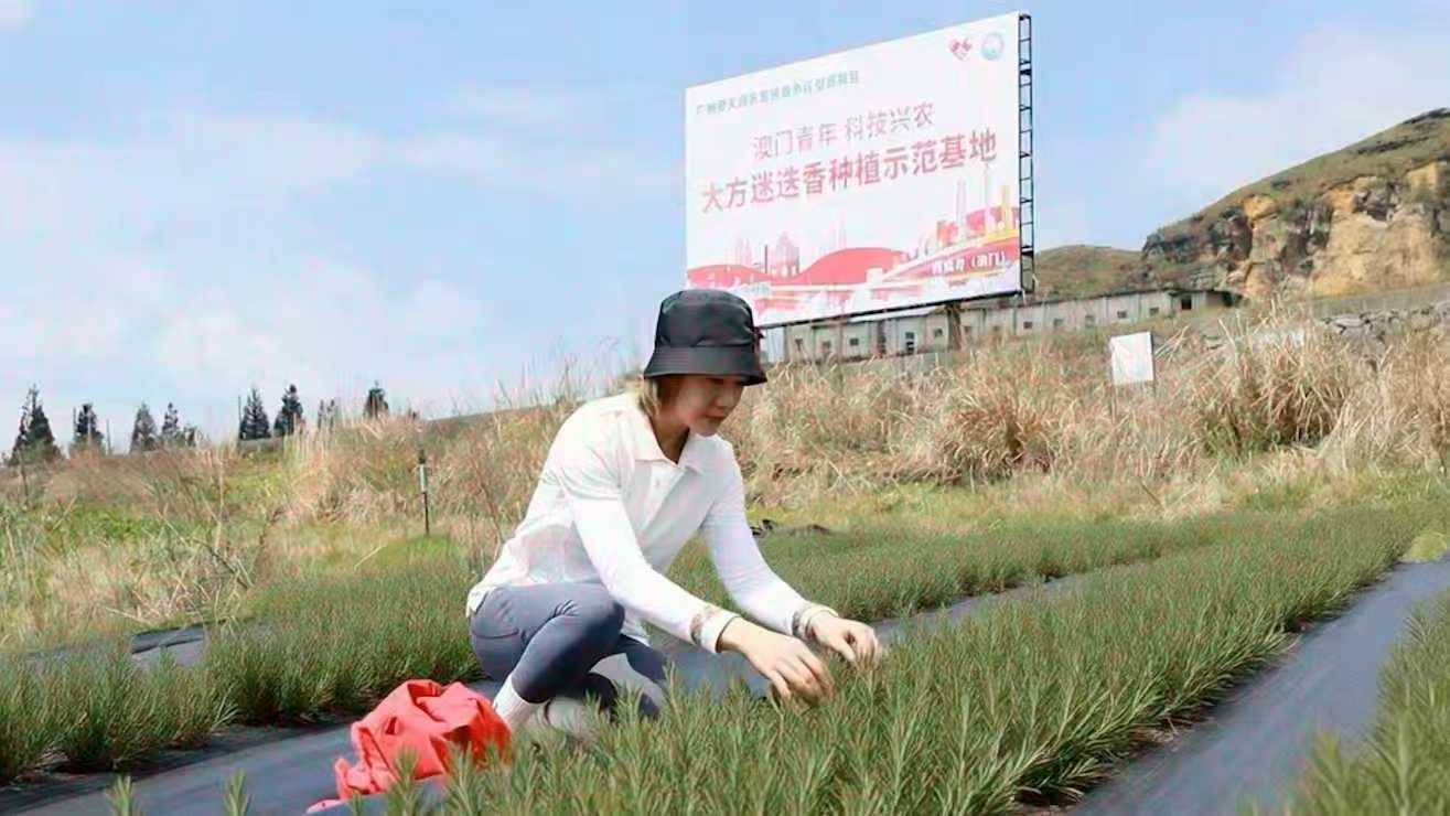 澳门后生创业团队在田间地头检讨迷迭香培植助长情况。