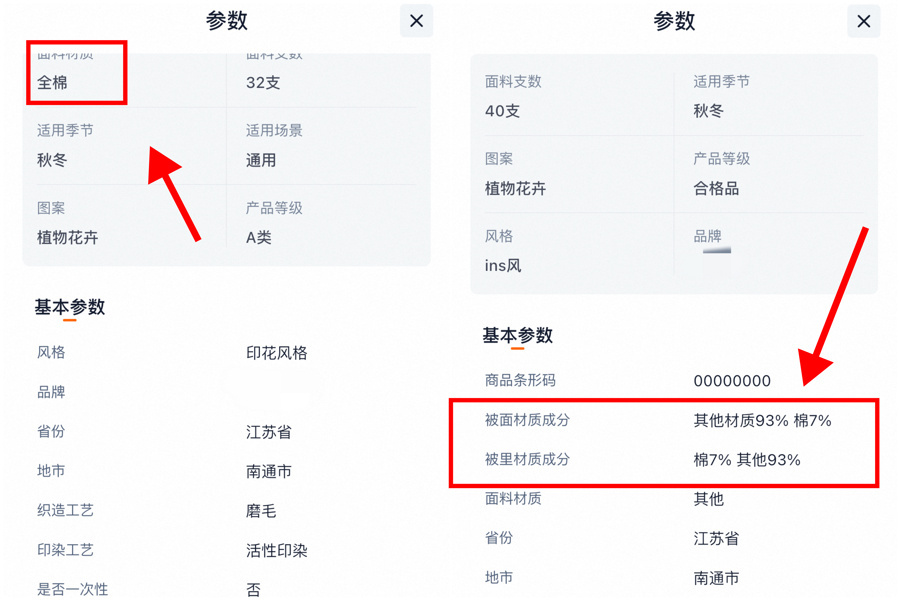 即即是电商平台销售的产物,相通应该真是标注纤维身分。除了“全棉”“100%棉”外,混纺材料也应注明具体的纤维称呼,但造访发现,标注不措施的商家比比都是(集结截屏)