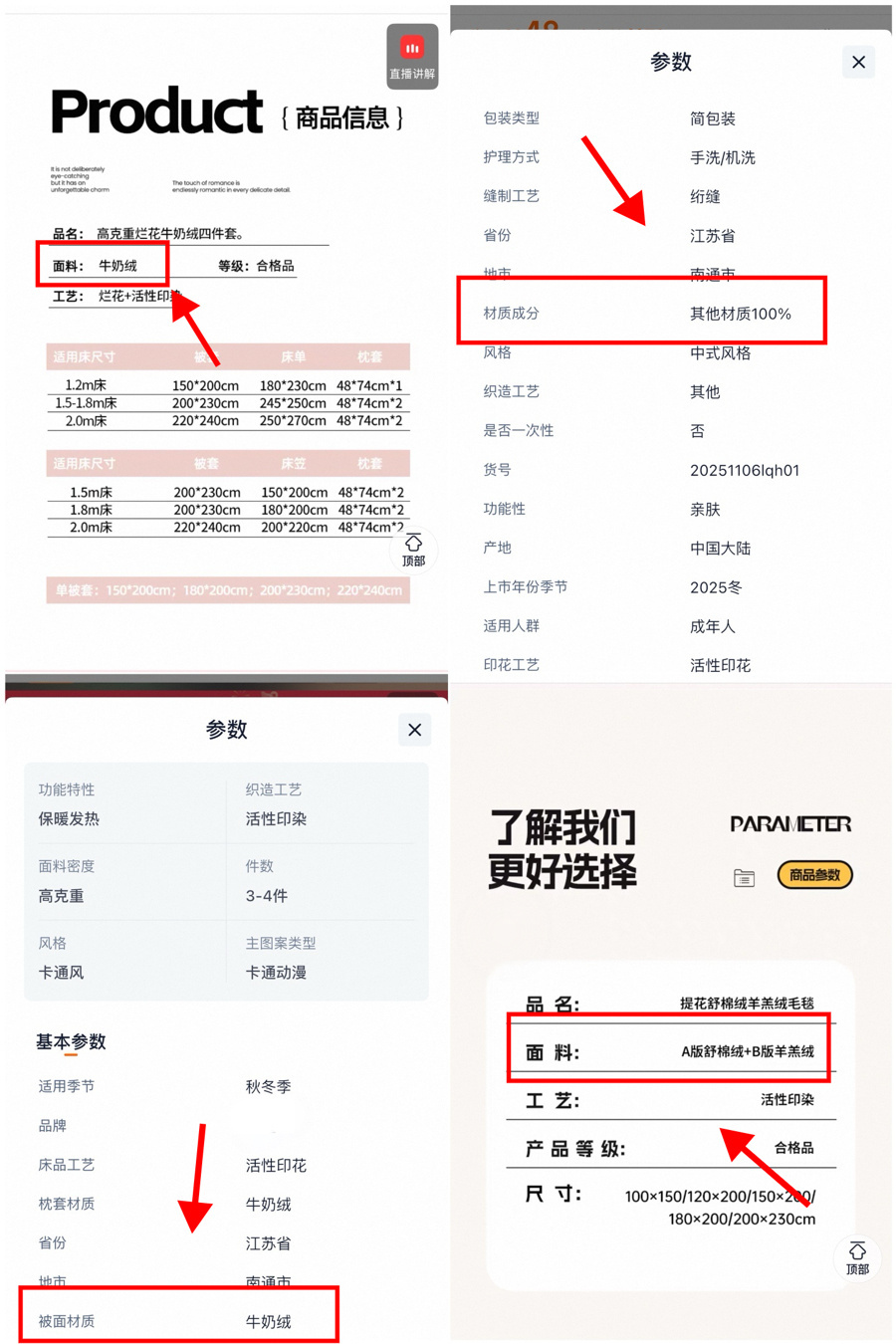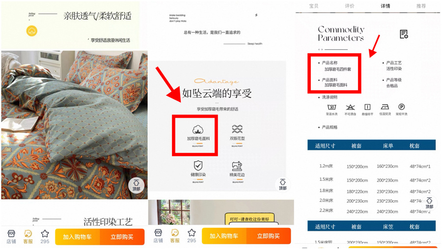 记者造访也发现,床上用品“玩倡导”的问题在电商平台尤其特殊。在线下市集,耗尽者不仅能触摸到产物,还不错迅速稽查商品的笃定标签或水洗标。对措施上市的产物来说,这些标签上都必须具备措施的纤维称呼。但在电商平台,绝大宽广商家莫得在产物先容页面提供产物笃定标签、水洗方向相片;而在先容“面料笃定”时,要么用商品实践称呼代替措施的纤维称呼,要么用“其他纤维”等字眼玩忽。也正因为此,好多耗尽者被误导。