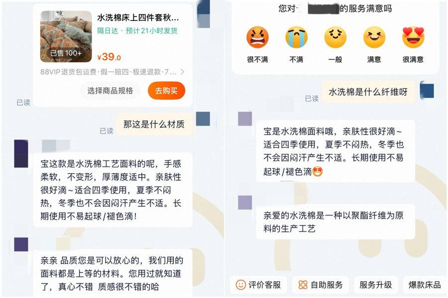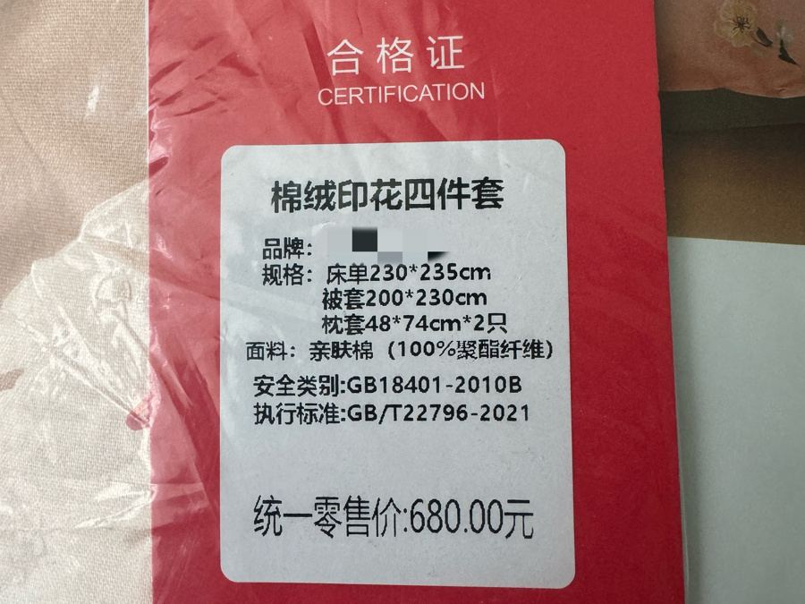 何女士示意,之是以买了“棉绒”四件套是因为旧年买过一款“全棉磨毛”的床上用品,“春夏用的床单、被套诚然是全棉的,但比拟光滑,冬天用着有点凉。全棉磨毛的四件套上有一层很薄的绒毛,触感比拟仁爱。”没思到,“棉绒”与“全棉磨毛”称呼相似,纤维身分却大相径庭——收到的产物标签上光显印着面料是“亲肤棉(100%聚酯纤维)”;商议客服,被申报“‘棉绒’和‘亲肤棉’都是用来形容触感的,不是材质”。