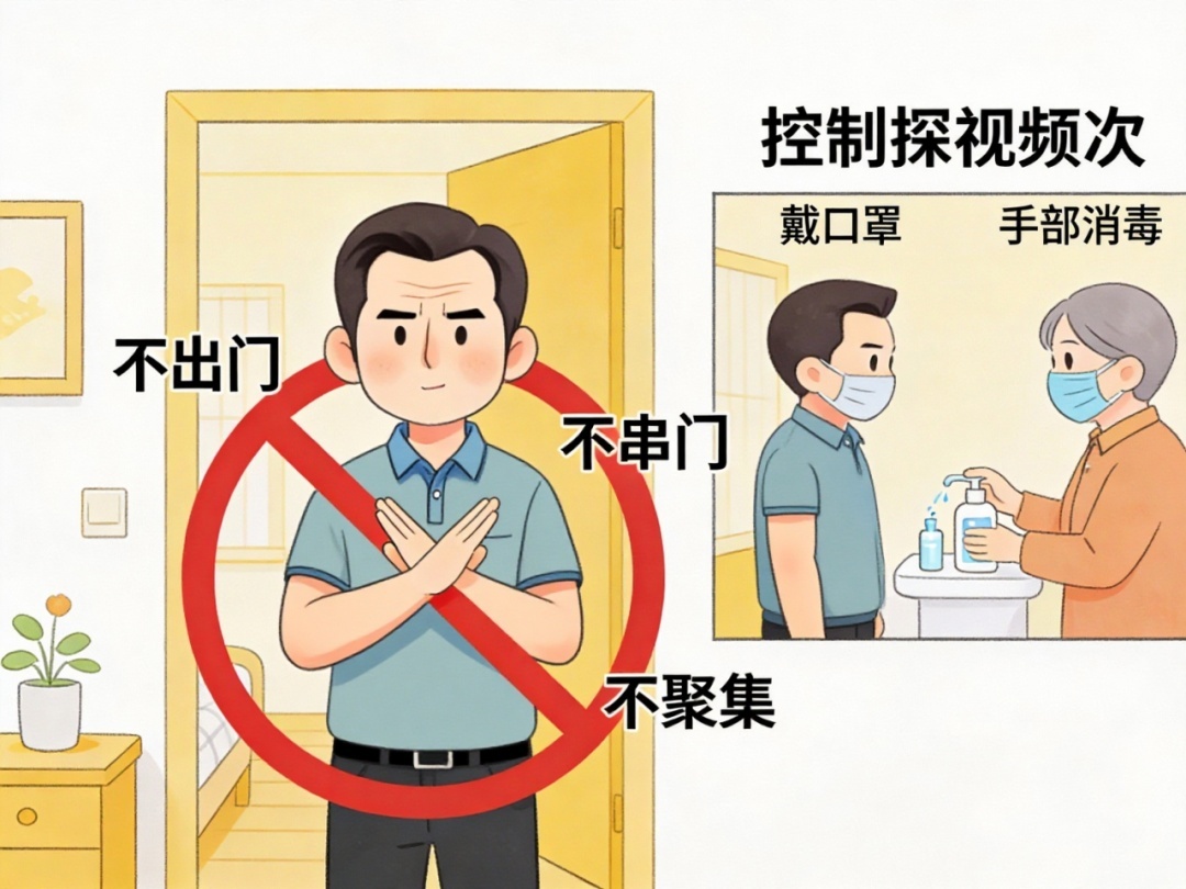 尽量不外出、不串门、不与病友网络,畛域探视频次,探视者需捎带口罩并配执部消毒。