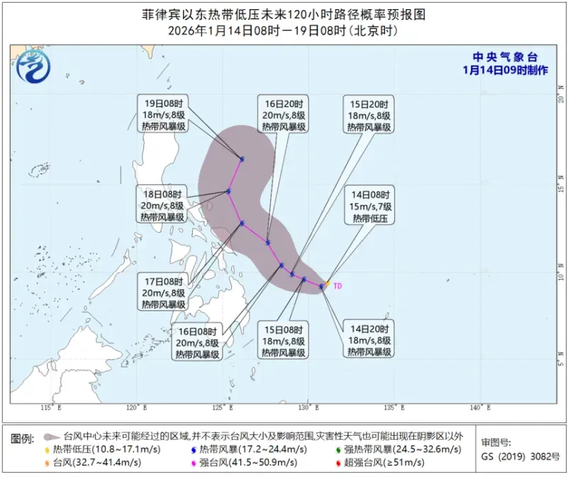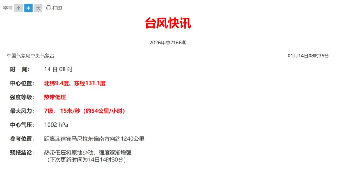 今早8时,热带低压中心位于菲律宾马尼拉东偏南边向约1240公里,即是北纬9.4度、东经131.1度,中心隔壁最大风力有7级(15米/秒),中心最低气压为1002百帕。