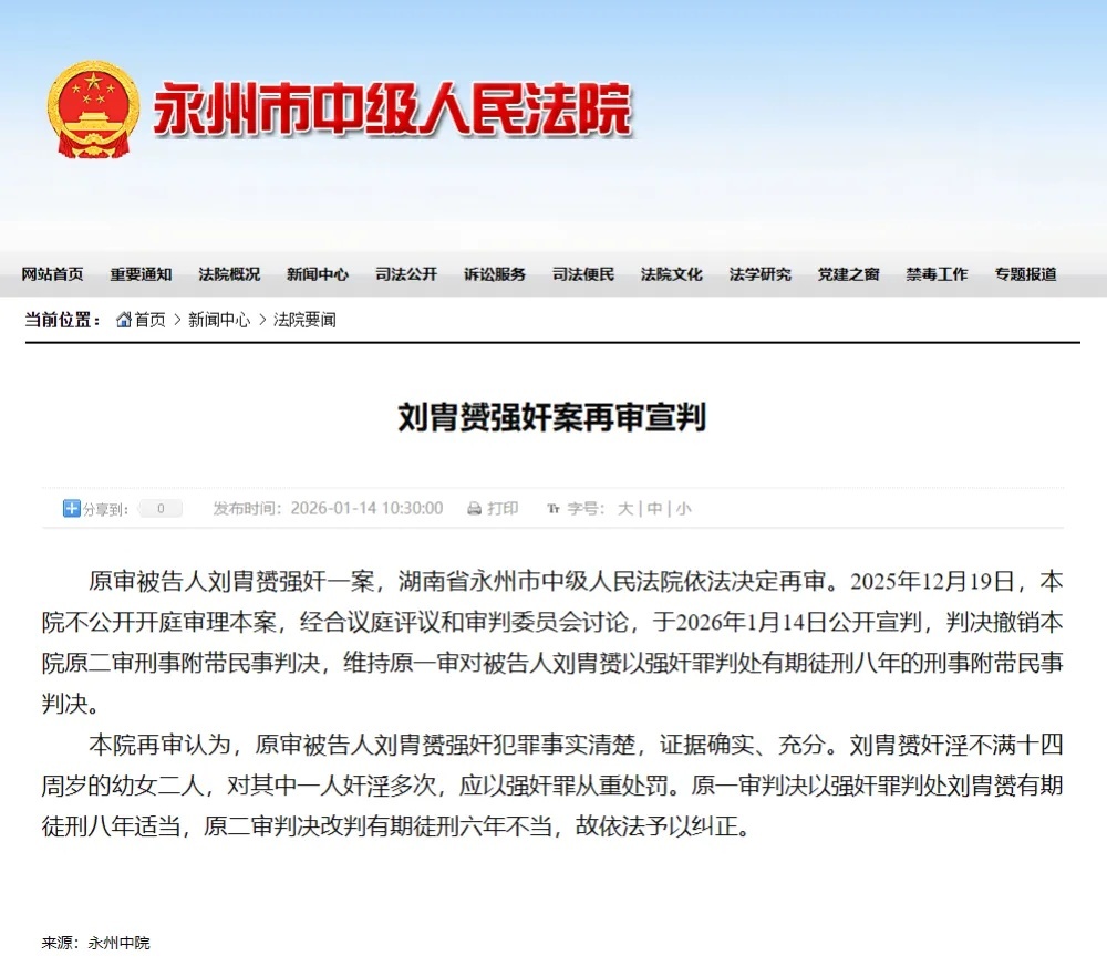 1月14日,湖南永州市中级东谈主民法院发布《刘胄赟强奸案再审宣判》,全文如下↓